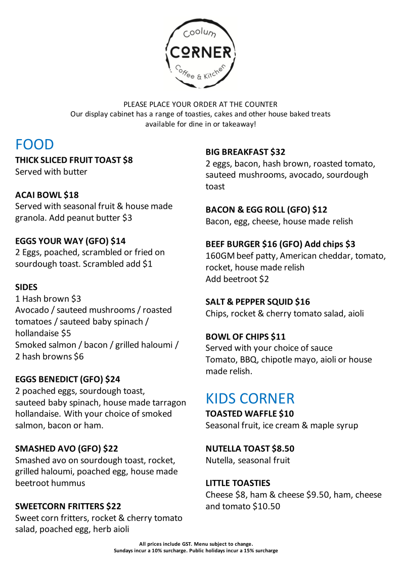 Welcome to Coolum Corner! Nestled in the heart of Coolum Beach, this charming café is a quintessential stop for beachgoers and locals alike. The menu boasts a delightful array of dishes that are both fresh and flavorful. Start your day with the Thick Sliced Fruit Toast for just A$8.00 or indulge in the vibrant Acai Bowl priced at A$18.00. For classic favorites, try the Eggs Your Way at A$14.00 or the hearty Big Breakfast for A$32.00, guaranteed to satisfy your hunger.